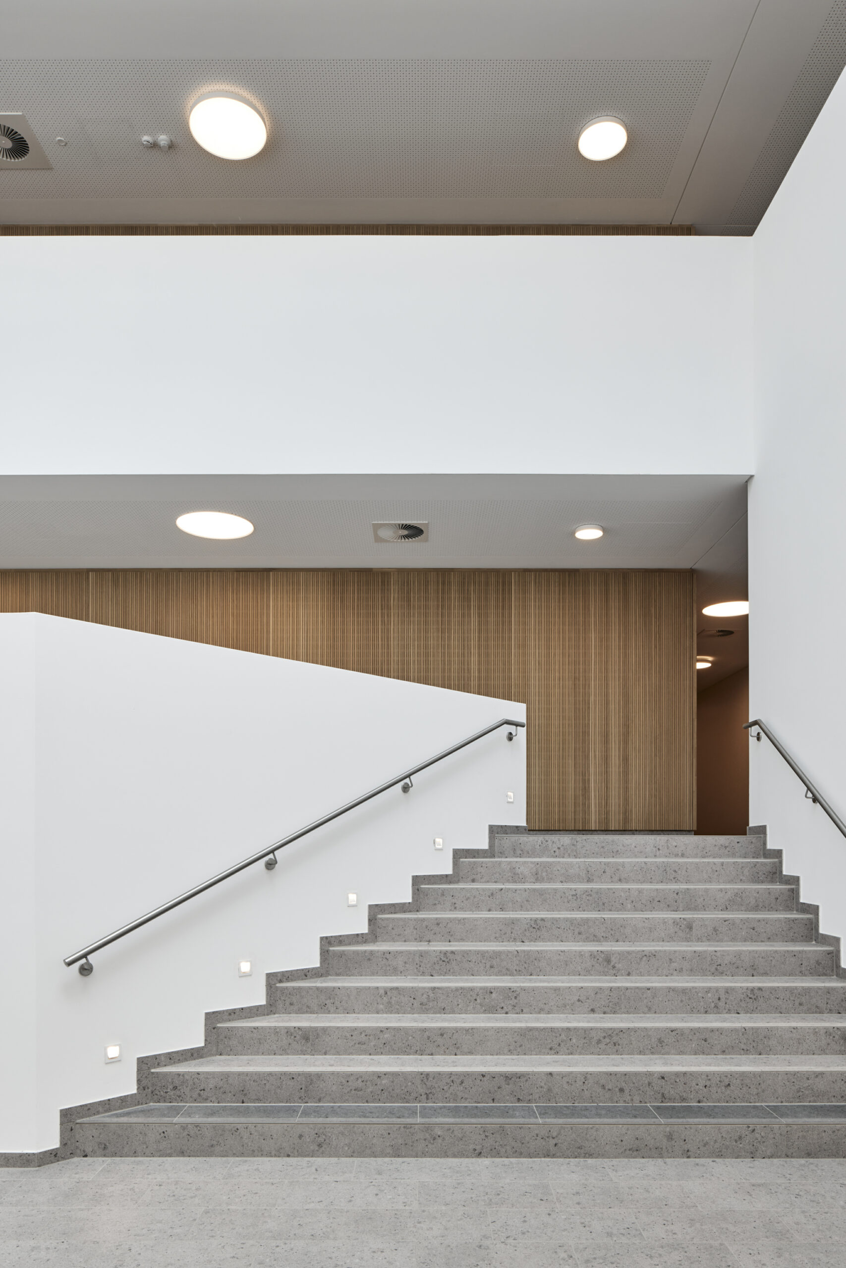 Die Beleuchtung in den Atrien und öffentlichen Bereichen stellt ein weiteres besonderes Gestaltungselement dar, das funktionale und ästhetische Aspekte harmonisch vereint. An den Decken sind runde Einbau- und Aufbauleuchten in verschiedenen Durchmessern installiert. Diese Leuchten sind nicht symmetrisch angeordnet, sondern werden in einer freien, chaotischen Verteilung platziert, was eine dynamische und lebendige Atmosphäre schafft.