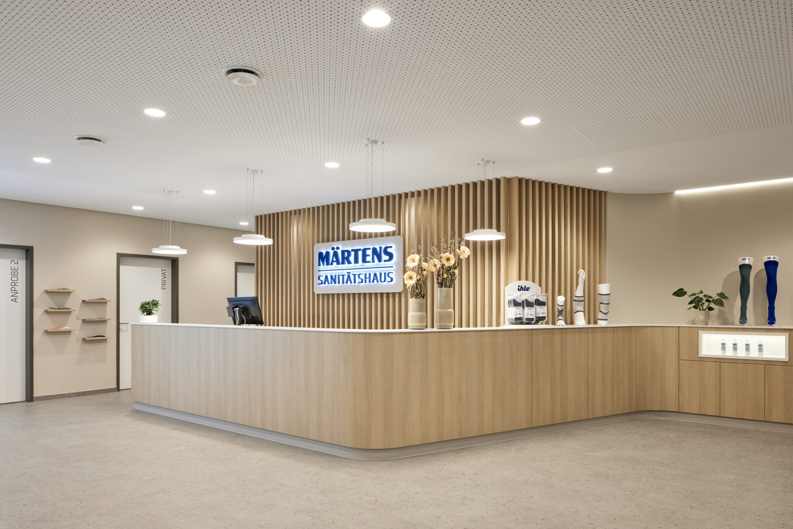 Die Gestaltung der Einbaumöbel, wie etwa des Empfangstresens in der Strahlentherapie, ist ebenfalls sorgfältig durchdacht. Die abgerundete Form soll einladend auf die Patienten wirken und sie willkommen heißen. Im Sanitätshaus wurde ebenfalls ein geschwungener Verkaufstresen gestaltet, der durch seine dynamische Formgebung sofort ins Auge fällt. Die Warte-, Beratungs- und Anprobe Bereiche wurden wohnlich gestaltet, um den Besuchern ein Gefühl von Komfort zu vermitteln.