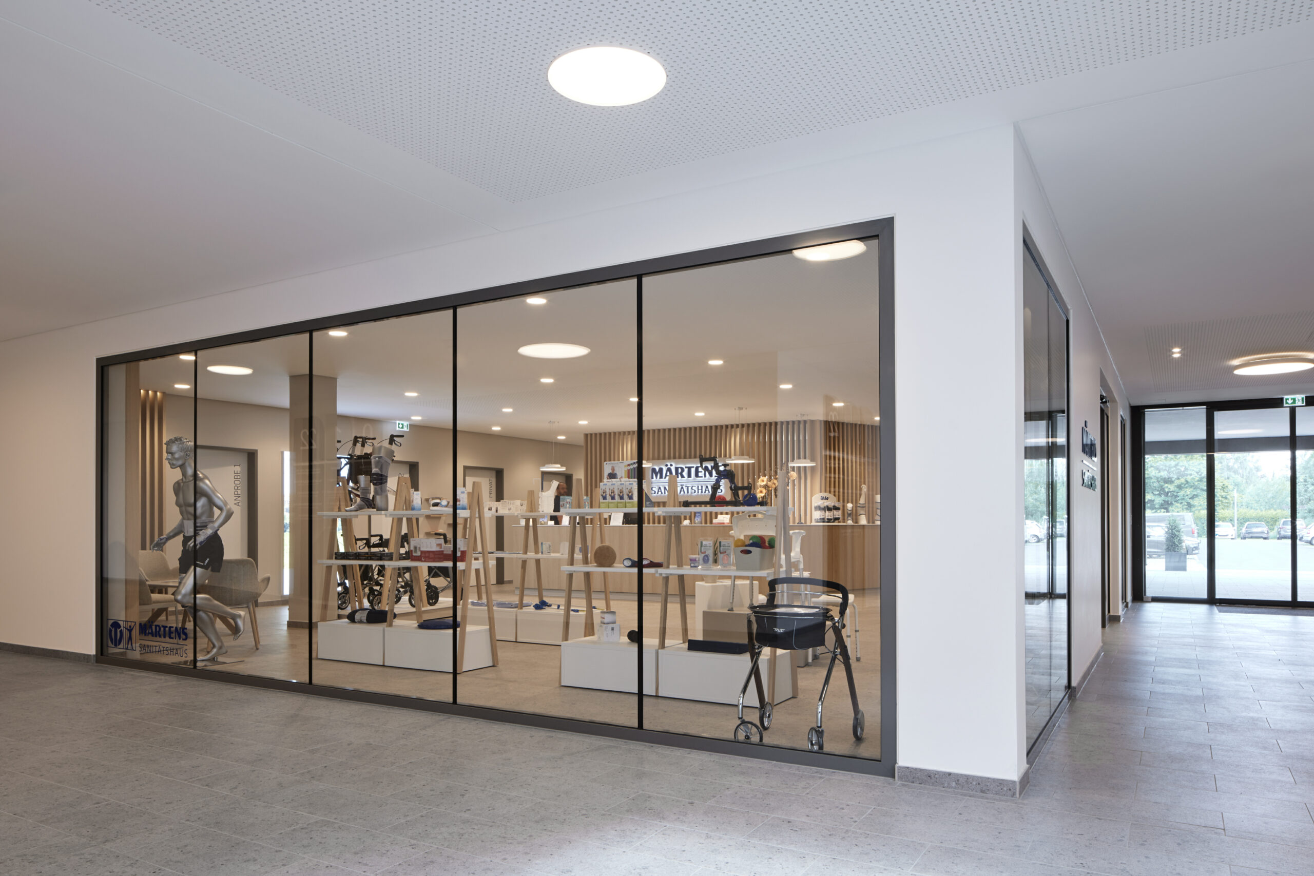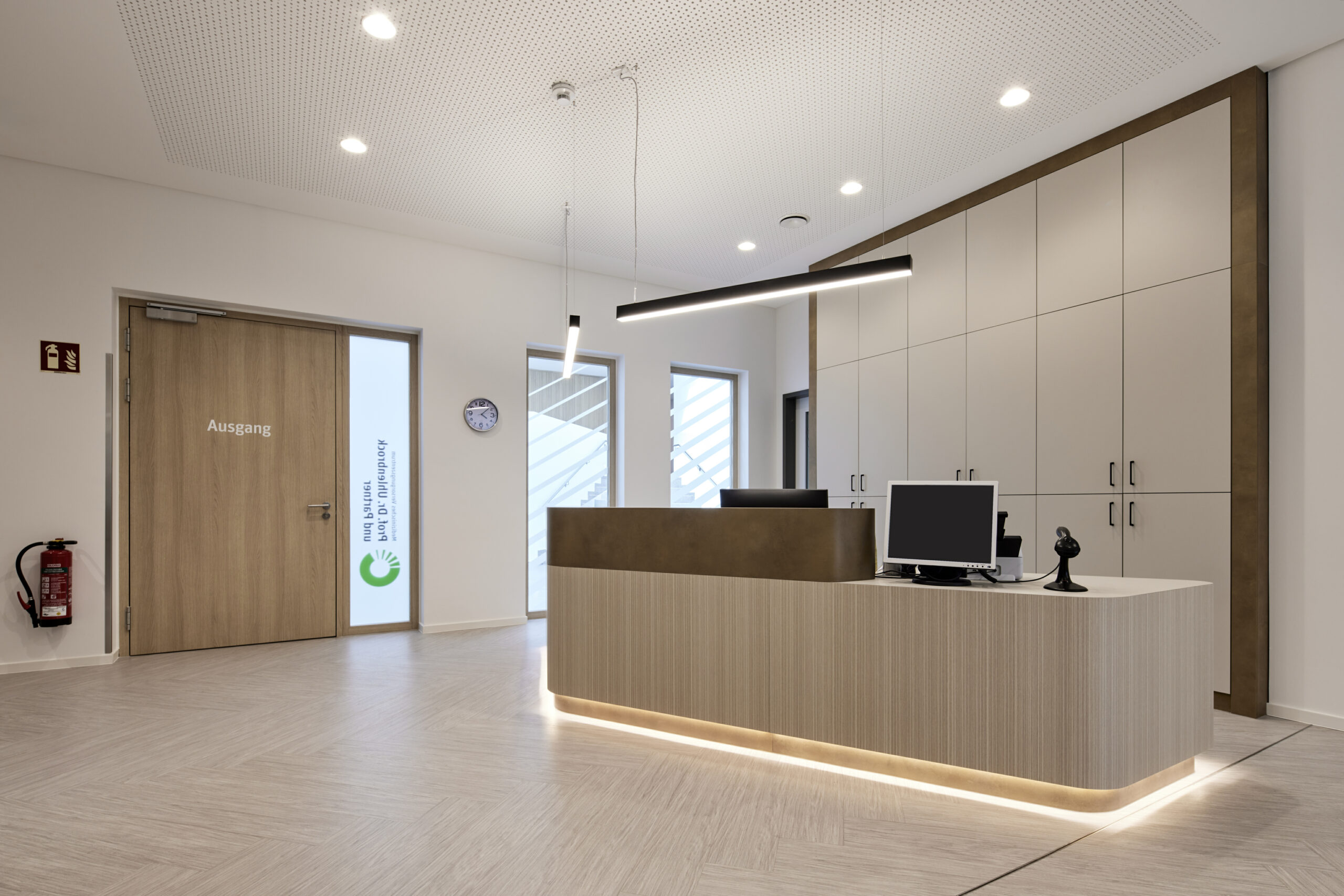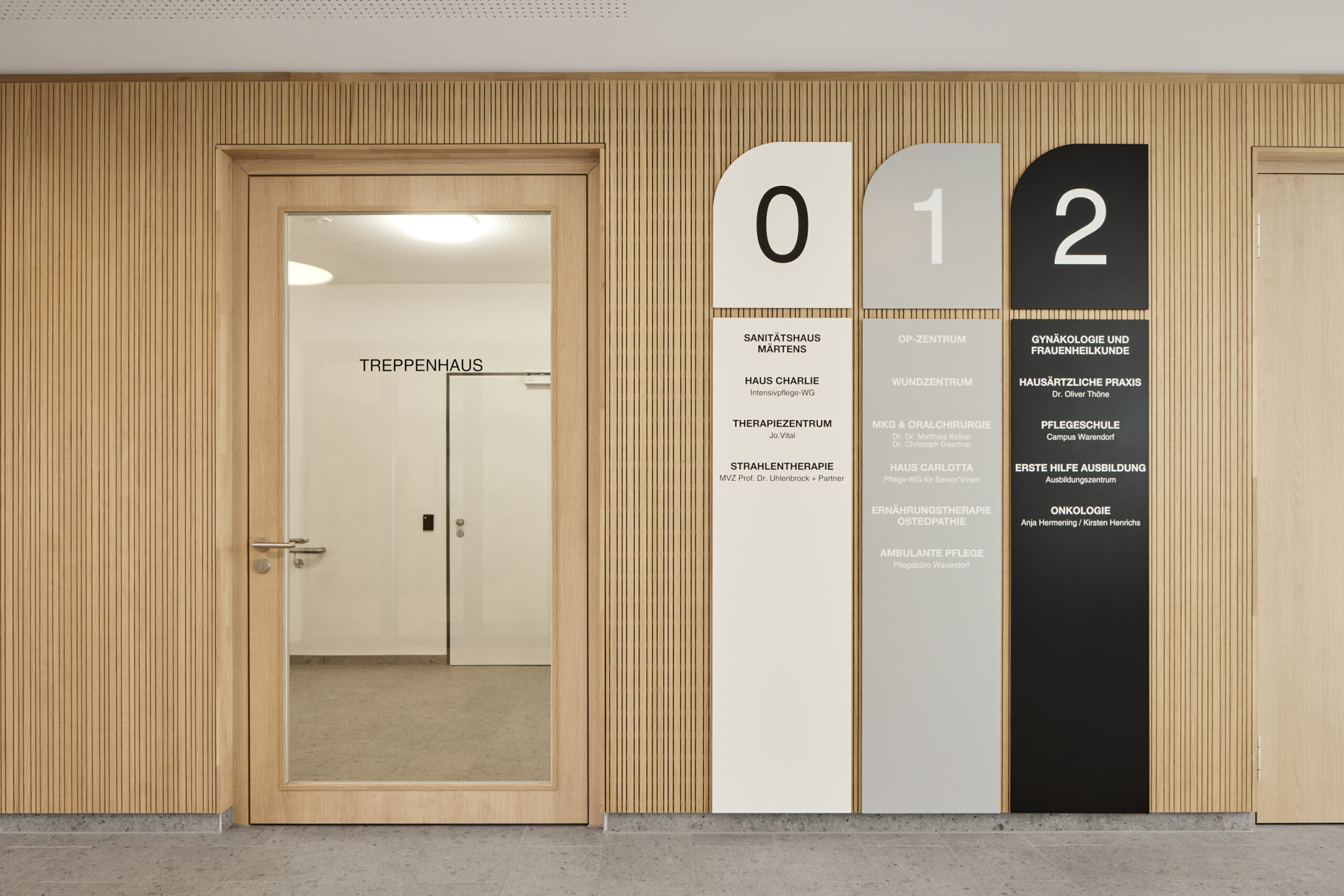 Teile der Wände sind mit akustisch wirksamen Lamellen aus Eichenholz verkleidet, die Eingangstüren zu den Praxen bestehen ebenfalls aus diesem Material. Eine farblich abgestimmte Beschilderung, die sich gestalterisch in das Gesamtkonzept einfügt, führt die Besucher und Besucherinnen durch das Gesundheitszentrum.