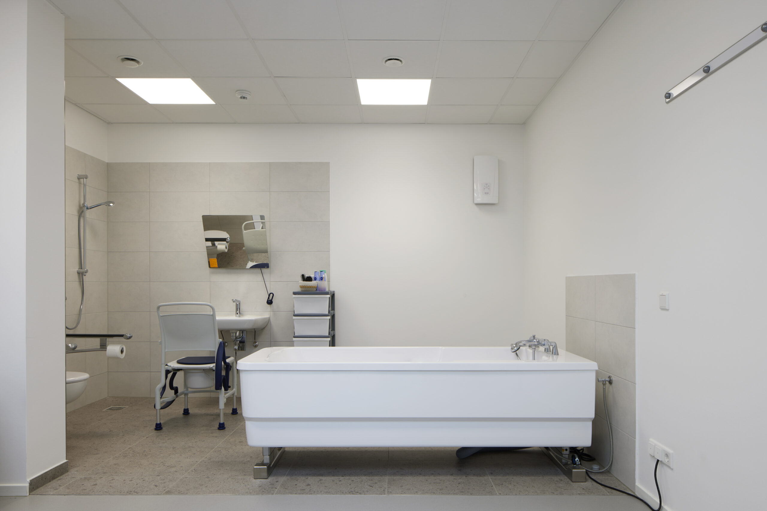 Die Wohngruppe im Erdgeschoss verfügt über einen direkten Zugang zu einer Terrasse, die Wohngruppe im Obergeschoss über einen großen Balkon. Eine Besonderheit sind die zwei Strahlenschutzbunker in der Strahlentherapie. Sie erforderten einen hohen Planungs- und Umsetzungsaufwand.
