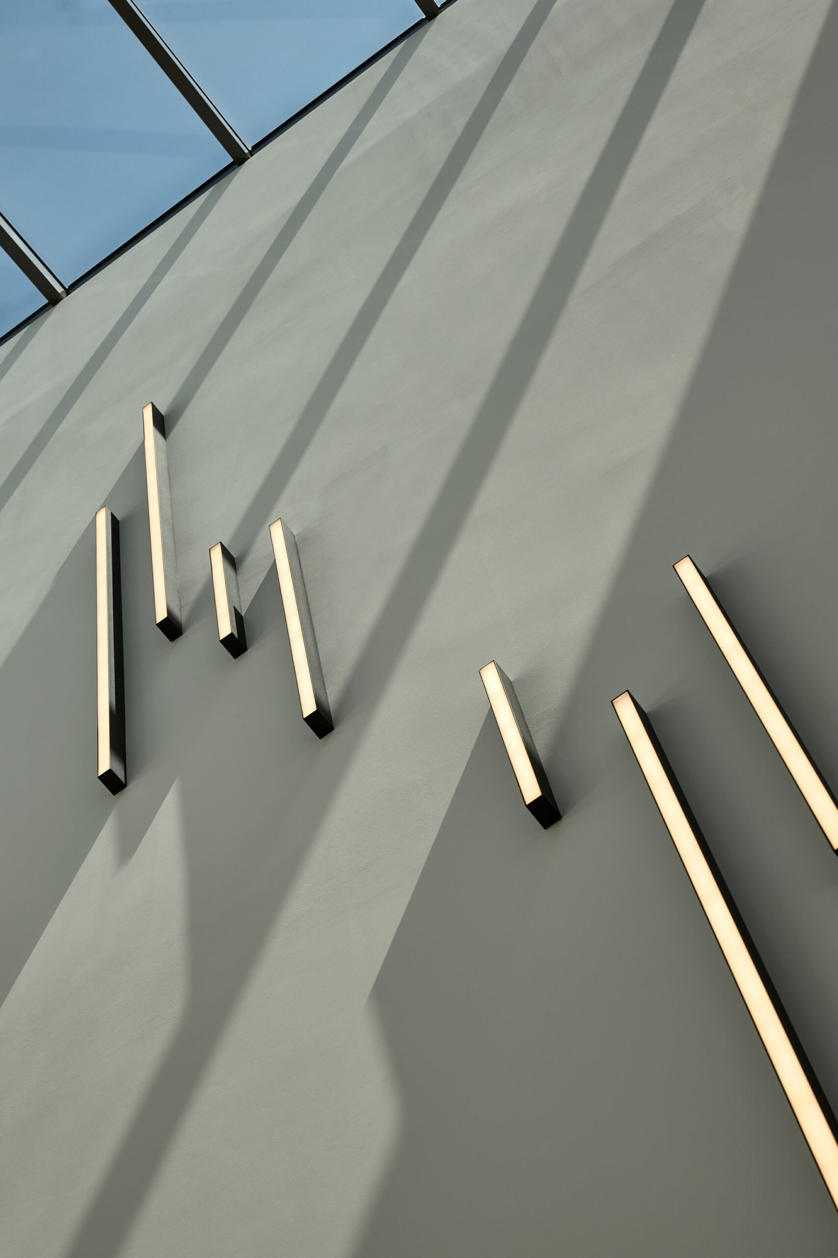 Die großzügigen Wandflächen der Lichthöfe werden durch linienförmige Leuchten hervorgehoben, die ebenfalls in unterschiedlichen Längen angebracht sind. Auch hier erfolgt die Anordnung der Leuchten unregelmäßig, was ein spannungsvolles Spiel von Licht und Schatten erzeugt. Insgesamt trägt diese besondere Beleuchtungsgestaltung zu einem einzigartigen Raumgefühl bei, das sowohl modern als auch ansprechend wirkt.
