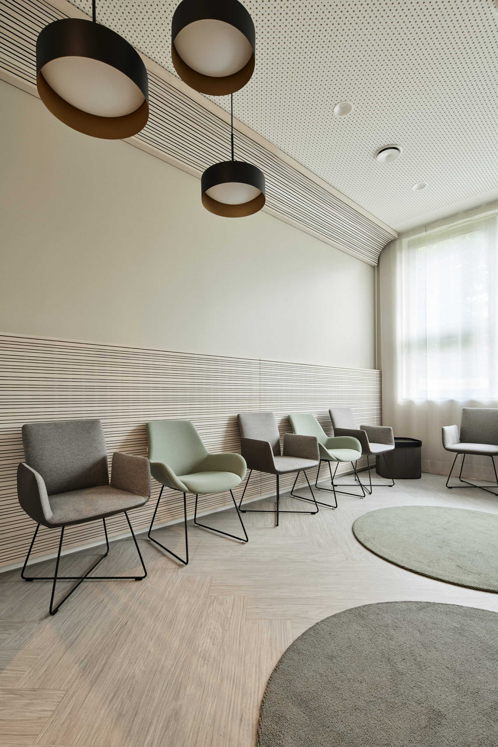Um die Wartezeit der Patienten so angenehm wie möglich zu gestalten, wurden die Wartezimmer mit vielfältigen Möbeln und Beleuchtungselementen eingerichtet. Die Holzverkleidung an den Wänden soll der Wirkung der hohen Decken entgegenwirken und eine gemütliche Atmosphäre schaffen.