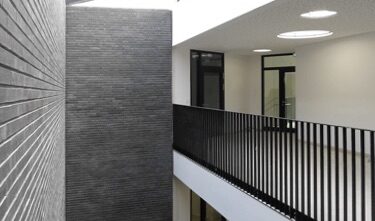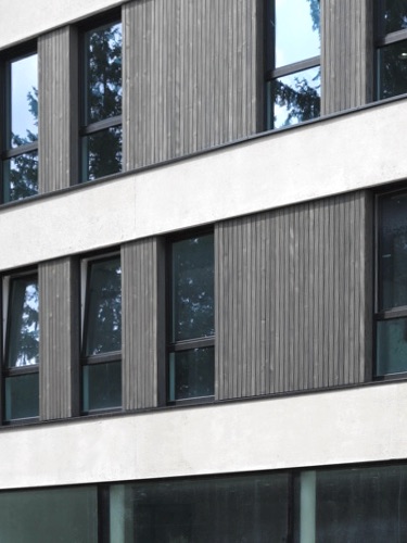 Das neue Ärztehaus nimmt die vorhandene Grundstücksgrenze entlang der Strasse auf und öffnet sich im hinteren Bereich mit einer schrägen Fassade zum Fluss, sodass der Blick von der Pflegeheim-Erweiterung Richtung Ufer möglich ist. Ebenso bietet dies die Möglichkeit der freien Sicht aus den neuen Praxisräumen des Ärztehauses Richtung Promenade und Flussufer.