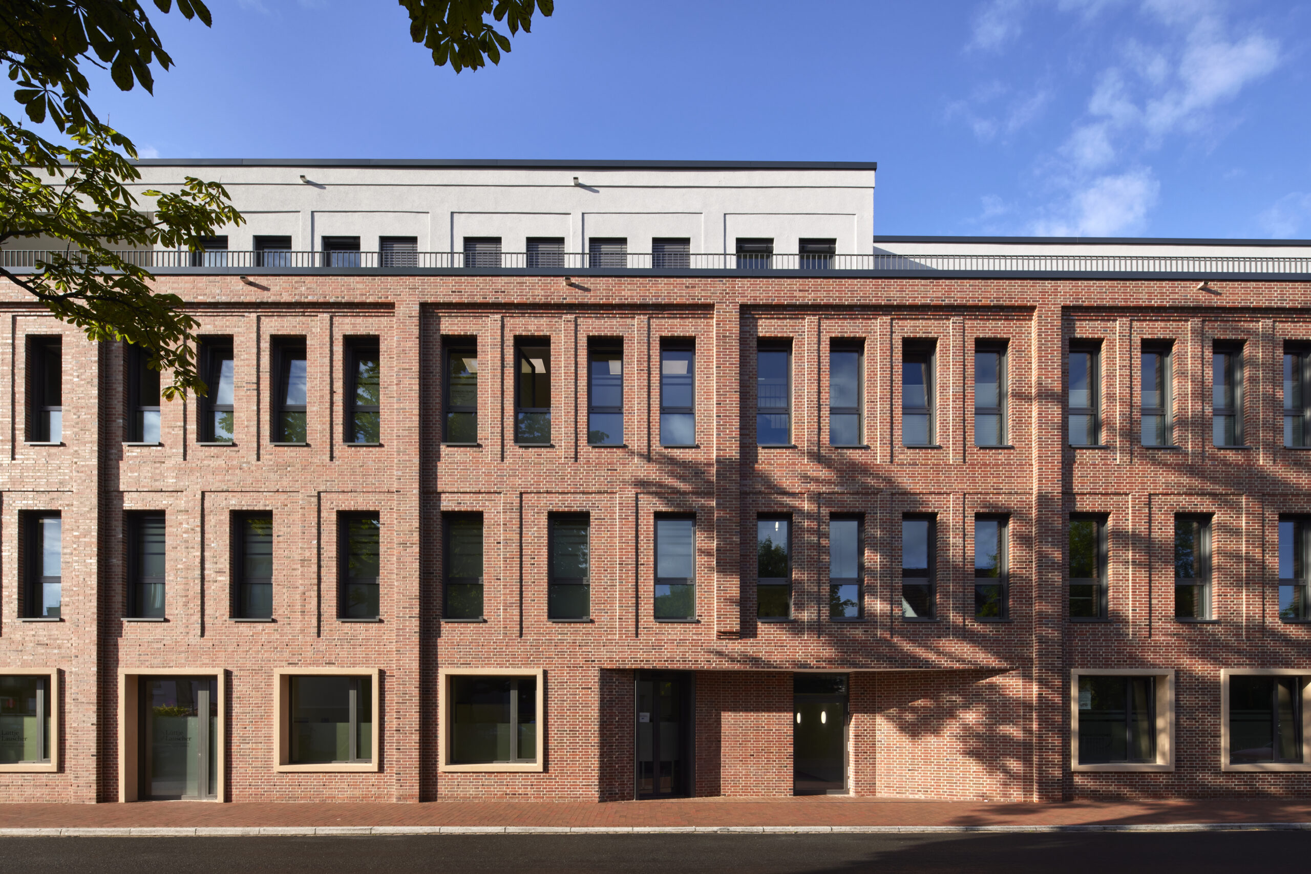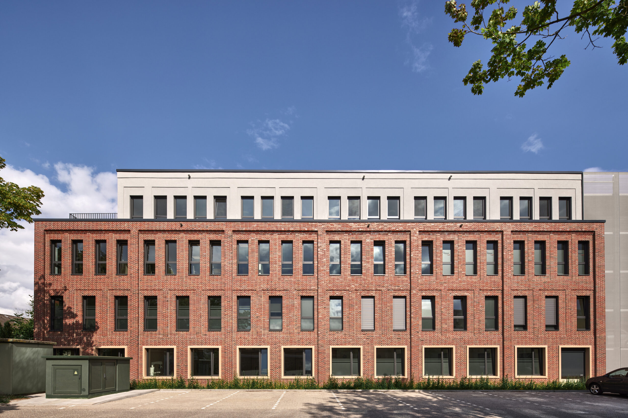 Die Großform des Ärztehauses vervollständigt die Blockbebauung der städtebaulichen Struktur. Die Gebäudehöhen orientieren sich am Bestand des ehemaligen Kasernengebäudes.