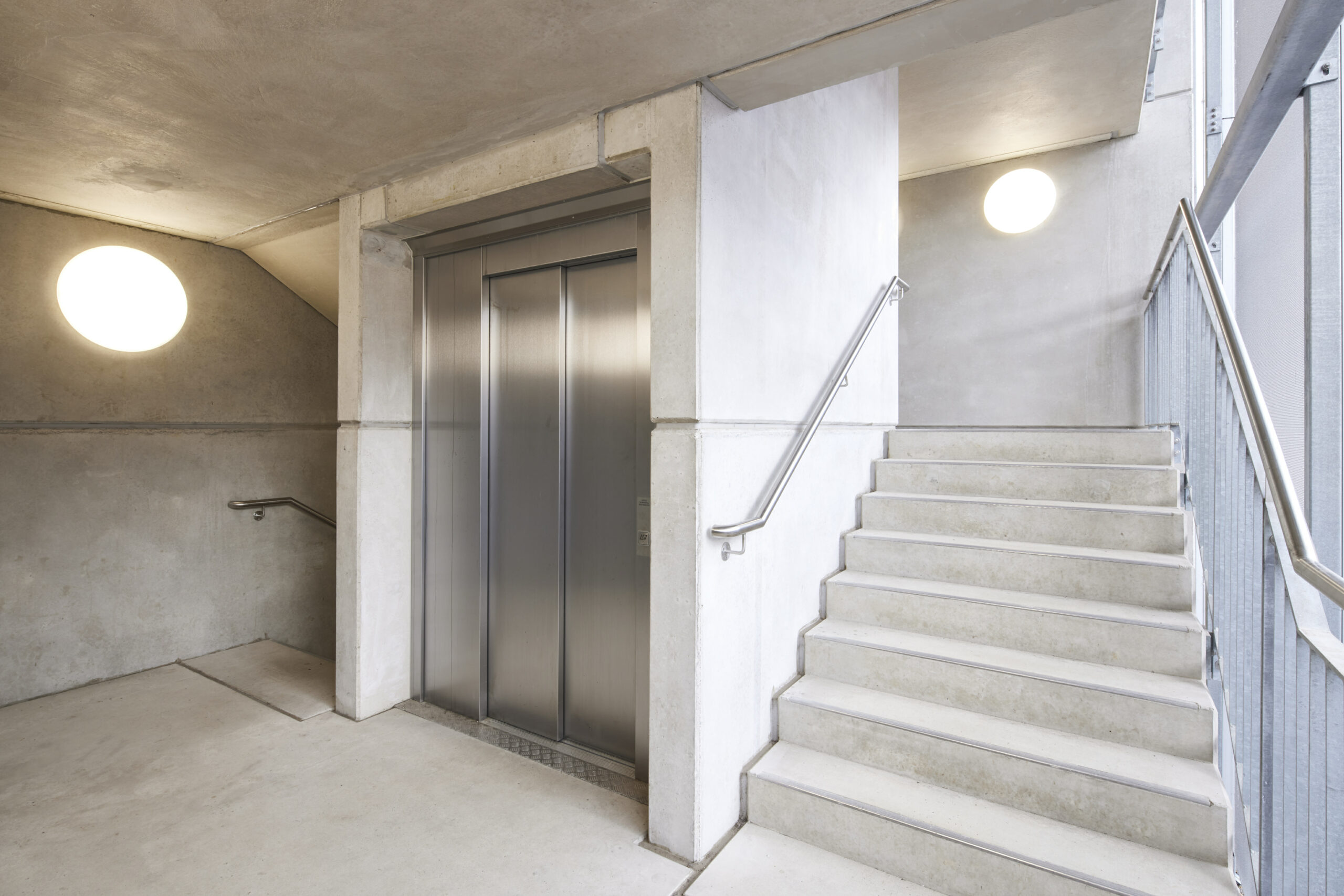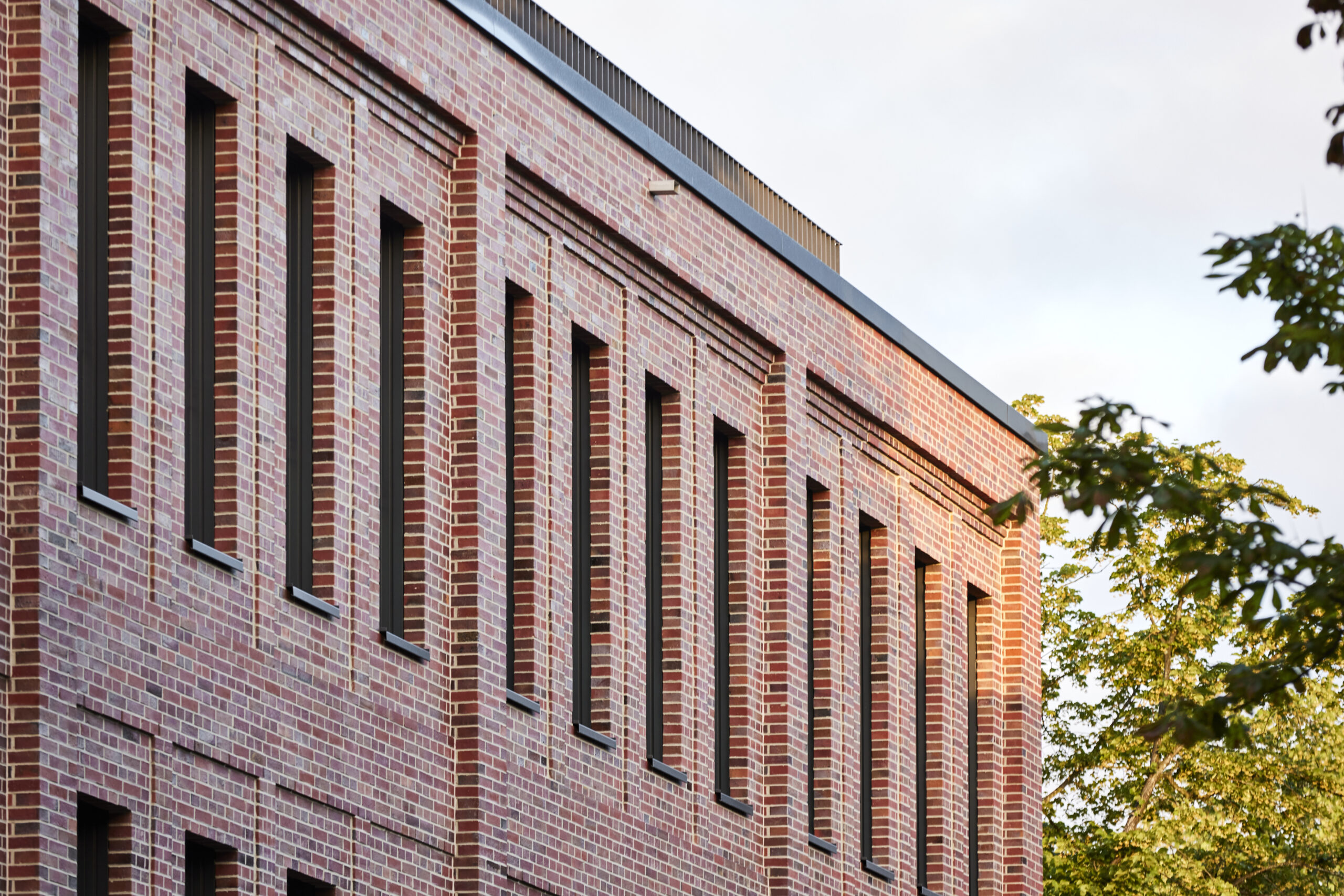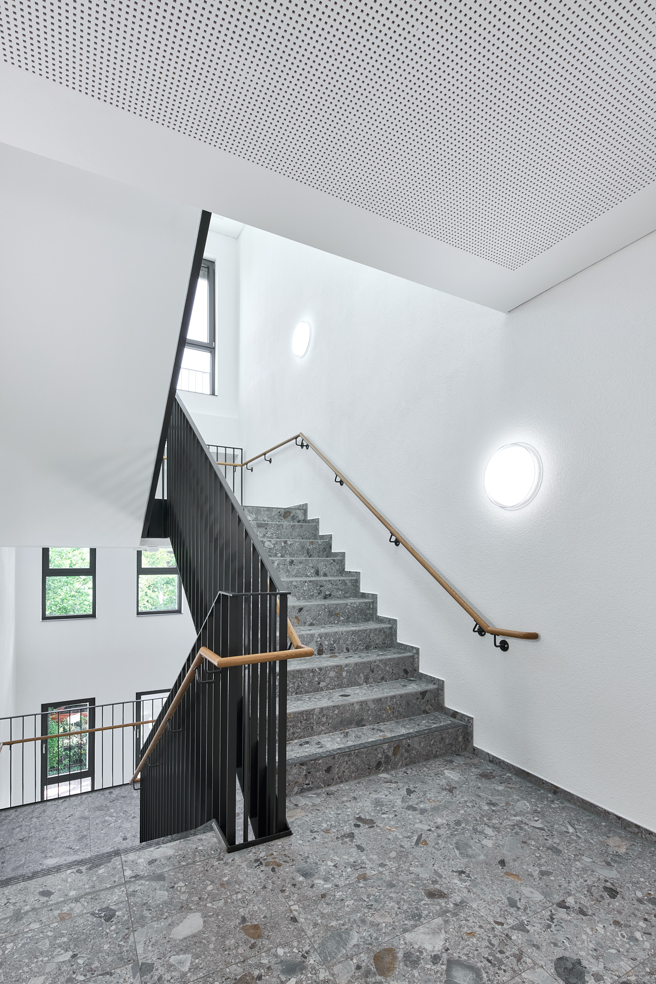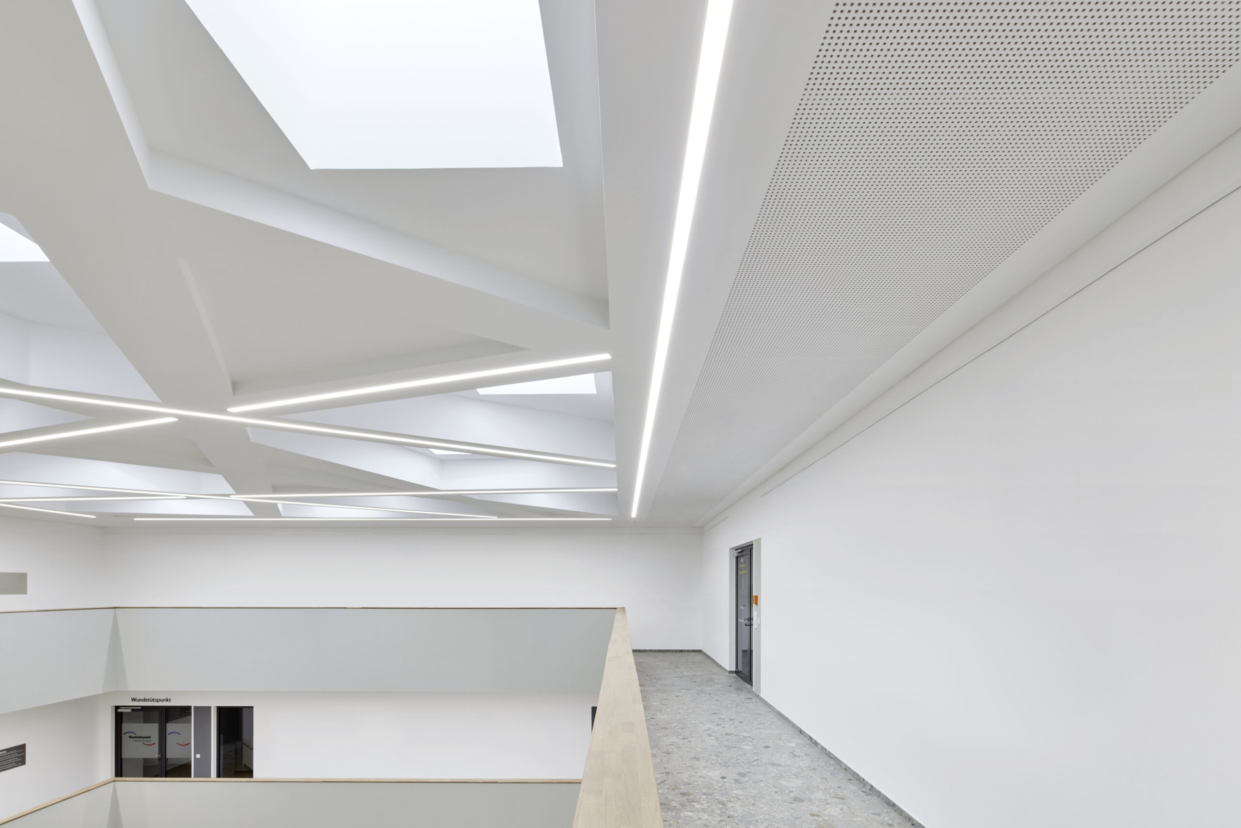 Über den zentralen Eingang von Osten aus gelangt man in ein im Zentrum liegendes Atrium. Das Atrium ermöglicht eine natürliche Belichtung im Kern des Gebäudes. Auf diese Weise werden notwendige Erschließungen sowohl horizontal als auch vertikal qualitativ aufgewertet. Es entstehen Bereiche mit Aufenthaltsqualität.