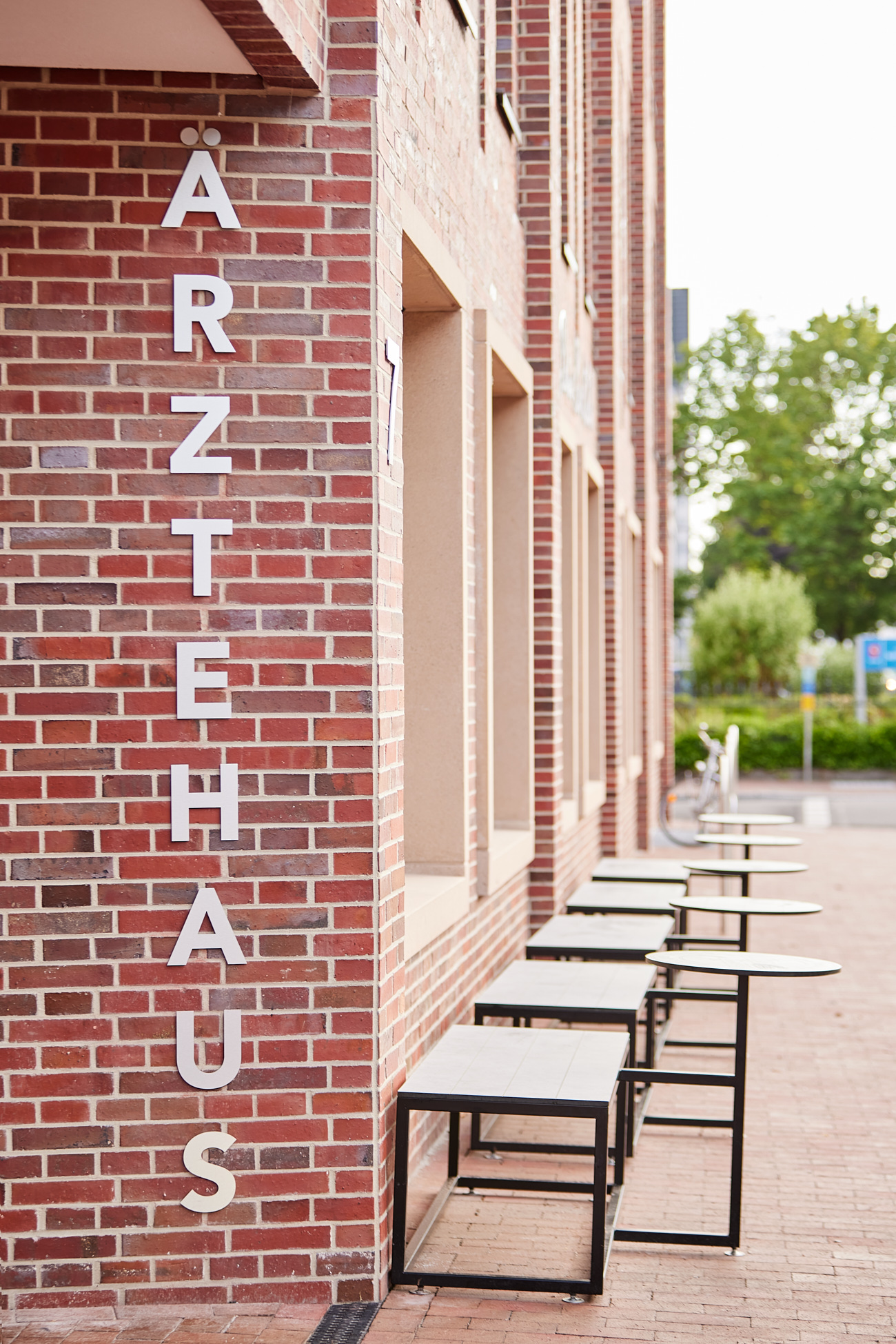 Das neue Ärztehaus befindet sich direkt gegenüber des Krankhauskomplexes. Der Haupteingang sowie die Park- hauseinfahrt befinden sich an der Auguststraße. Öffentliche Nutzungen im Erdgeschoss, wie z. B. ein Café, ziehen die Besucherströme an. Ab dem ersten Obergeschoss findet der Besucher die Praxen.
