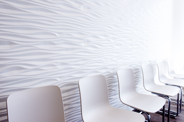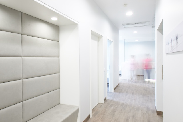Die Ausrichtung zur Reichstrasse ermöglicht aus fast allen Räumen den direkten Blick auf den Park am Kaiserteich. Die PatientInnen werden mit hellen Farben und Oberflächen in einer klaren, ruhigen Atmosphäre empfangen: Der weiß lackierte gerundete Empfang – der wie alle eingebauten Möbel eigens für die Praxis angefertigt wurde – leitet mit indirekter LED-Beleuchtung zum Wartebereich. Hier erhielt eine der Wände eine besonders aufwändige Gestaltung: Das großflächige Wandpaneel mit dreidimensionalen wellenförmigen Fräsungen wirkt wie eine naturgetreue Abbildung eines Sandstrandes und setzt das rote LC2-Sofa in Szene. Ganzglaswände am Personalraum erweitern optisch den Flur und leiten den Patienten, die Patientin zum VIP-Warteraum und zu den Untersuchungs- und Behandlungsräumen.